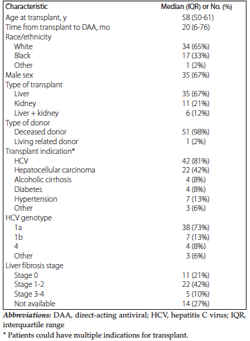 This was a retrospective, single-center cohort study at Duke University Hospital, with data obtained from patients seen between October 1, 2014 and March 31, 2017. The study was approved by the hospital institutional review board and performed in accordance with the Helsinki Declaration of 1975. Liver and kidney (combined or single transplant) transplant recipients aged 18 years and older were identified by querying prescriptions for one of the following DAA regimens: ledipasvir-sofosbuvir, daclatasvir-sofosbuvir, or velpatasvir-sofosbuvir. Manual electronic chart review was performed to confirm that patients met inclusion criteria and to collect data.