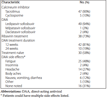 The use of DAAs in transplant recipients is generally considered safe based on the available evidence. These agents are well-tolerated, and side effects are typically mild. Patients with more advanced liver disease might be more prone to certain adverse effects than those with mild liver disease.17 Graft dysfunction or rejection during or after DAA treatment may occur, but these rates are low compared with previous HCV treatment modalities. One study demonstrated a 3.4% incidence of immune-mediated graft dysfunction followed by DAA therapy in 978 liver transplant recipients; however, none of these events resulted in graft loss.22 These investigators found that elevated liver enzyme tests during and after DAA were significantly associated with DAA immune-mediated graft dysfunction. There were no episodes of BPAR in our study, and no patients had to stop DAA therapy early. It is prudent to monitor closely for side effects or graft dysfunction during and shortly after DAA therapy; elevated liver enzyme tests or decreased renal function during treatment should be considered a signal for further investigation and earlier intervention.