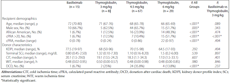 Results: Patients were subdivided into the following 4 induction immunosuppression groups: basiliximab (n = 15, 12.6%), 3 mg/kg thymoglobulin (n = 8, 6.7%), 4.5 mg/kg thymoglobulin (n = 67, 56.3%), and 6 mg/kg thymoglobulin (n = 29, 24.4%). All patients received pulse doses of methylprednisolone followed by a prednisone taper. Other maintenance immunosup­pression agents included tacrolimus and mycop­henolic acid. Recipients in the basiliximab and 3 mg/kg thymoglobulin groups were older (median age >70 years; P < .001). The 4.5 and 6 mg/kg thymoglobulin groups had higher proportions of African American patients and patients with calculated panel reactive antibody over 20%. There were significantly fewer infectious complications in the basiliximab and 3 mg/kg thymoglobulin groups. Despite differences in biopsy-proven acute rejection rates, estimated glomerular filtration rate and graft and patient survival rates at 1 year were similar across groups. All patients with biopsy-proven acute rejection were African American patients.