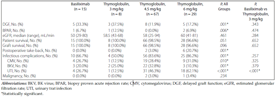 The basiliximab and 3 mg/kg thymoglobulin groups had no operative take-backs, whereas the 4.5 and 6 mg/kg thymoglobulin groups had a significantly higher rate of return to the operating room within the first week of transplant (3% and 20.7%; P = .001). The recorded indications were all cases of retroperitoneal bleeding. Review of infectious complications showed that the 3 most common infections were CMV, BKV, and UTI. Patients in the 4.5 mg/kg thymoglobulin group and the 6 mg/kg thymoglobulin group experienced a higher rate of infectious complications than the basiliximab and 3 mg/kg thymoglobulin groups (P = .001). The basiliximab group experienced an infection rate of 66.67% (n = 10), with 30% due to UTI. The 3 mg/kg thymoglobulin group experienced an infection rate of 50% (n = 4), with 25% due to BKV. The 4.5 mg/kg thymoglobulin group experienced an infection rate of 83.6% (n = 56), with 46.3% due to UTI. The 6 mg/kg thymoglobulin group experienced an infection rate of 86.2% (n = 25), with 62.1% due to UTI. Three malignancies occurred in the study cohort. Two patients (2.9%) in the 4.5 mg/kg thymoglobulin group were diagnosed with cancer, one with acute myeloid leukemia and other with squamous cell carcinoma of the mandible. A patient who received 6 mg/kg thymoglobulin (3.4%) was diagnosed with meningioma within 1 year posttransplant.