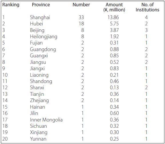 From 1986 to 2022, the NSFC funded 30 institutions across 20 provinces in the field of lung transplantation. Regarding the geographical distribution of funding, Shanghai and Hubei emerged as the top 2 funded regions. Both provinces had over 18 projects and received over ¥5 million in funding. Shanghai ranked first with 33 funded projects, accounting for over one-third of the total number of funded projects and receiving over one-third of the total funds. Overall, the regional distribution of project funding was unbalanced (Table 1).