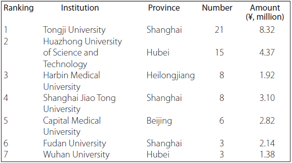 Over the span of 37 years, NSFC has funded lung transplant projects in 20 provinces. However, the top 2 regions, Shanghai and Hubei, accounted for over half of the funded projects, with Shanghai accounting for over one-third, reflecting a significant regional imbalance. Moreover, only 30 institutions nationwide received funded projects, with Tongji University alone securing 22.58% of the funded projects. Additionally, the top 7 institutions are traditional medical schools, including 3 in Shanghai and 2 in Hubei. This indicates a significant disparity in competitive strength among institutions in the field of lung transplantation.