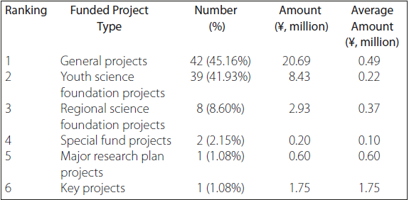 The NSFC funding categories include key projects, general projects, youth science foundation projects, regional science foundation projects, major research plan projects, National Outstanding Youth Science Foundation projects, and special fund projects. Data analysis revealed large differences in the number and funding amounts among these categories (Table 3). General and youth science foundation projects accounted for 45.16% and 41.93% of the total number of projects, respectively. However, the average funding amounts were ¥0.49 million and ¥0.22 million, respectively. Major research plans and key projects had smaller numbers but relatively high average funding, with individual averages of ¥0.60 and ¥1.75 million, respectively.