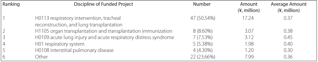This study revealed that the major projects funded were general and youth science foundation projects. Only 1 key project and 1 major research plan project were funded. Innovative research group projects, National Science Fund for Distinguished Young Scholars, and other high-level funding were lacking. This indicates a scarcity of high-level research achievements with international prominence in China and a limited number of research experts and teams at the forefront of the field. Therefore, enhancing the scientific research level in the field of lung transplant in China is essential for enhancing the development of lung transplant medical technology, which will be beneficial to patients who require lung transplant.