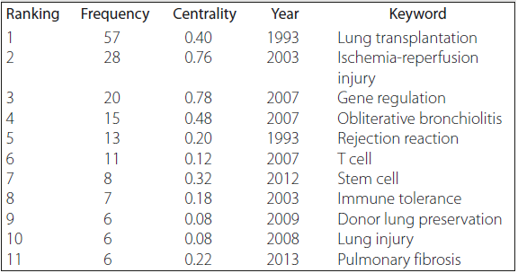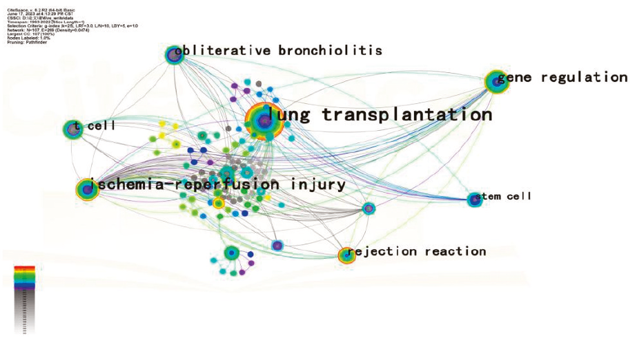 Key word co-occurrence analysis. We used CiteSpace to construct a key word co-occurrence network graph. The comprehensive high-frequency and high-centrality key word distribution and the co-occurrence relationship graph are shown in Table 5 and Figure 2. The research hotspots of lung transplantation inclu-ded ischemia-reperfusion injury, gene regulation, obliterative bronchiolitis, rejection reaction, T cell, and stem cell.