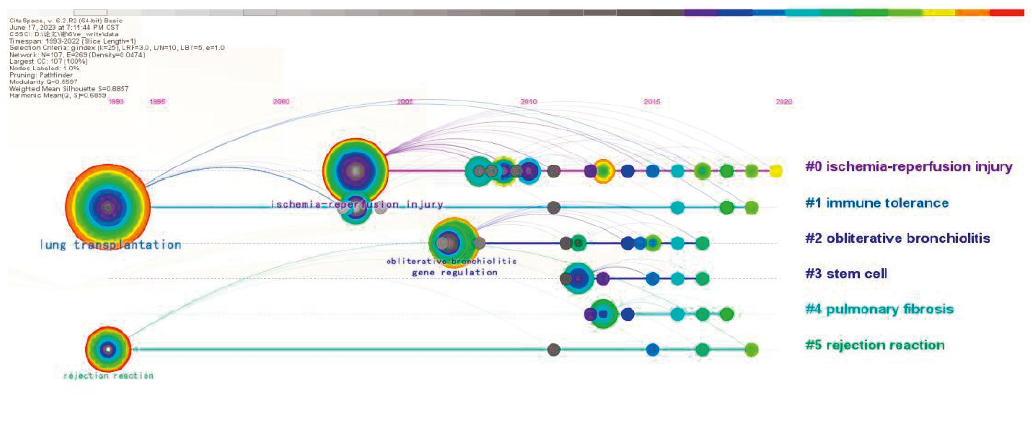 We identified 6 main research clusters: ischemia-reperfusion injury, immune tolerance, obliterative bronchiolitis, stem cell, pulmonary fibrosis, and rejection reaction.
