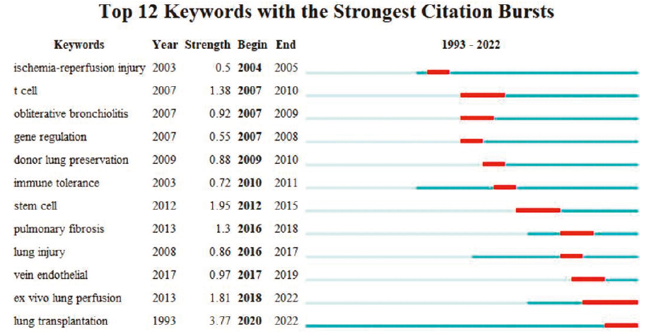 This study revealed that the main key word bursts from 2010 to 2018 were immune tolerance, stem cell, pulmonary fibrosis, and lung injury. However, in the past 5 years, the main key word bursts are now “vein endothelial” and “ex vivo lung perfusion” This indicates a change in the lung transplant research focus in China. Previously, the emphasis was on immune rejection and lung injury after lung transplant, and efforts were made to suppress and improve these aspects. Recent research has increasingly focused on pre-lung transplant, such as donor lung preservation, maintenance, and tissue research, to address the root cause by eliminating signals that induce inflammation and injury.