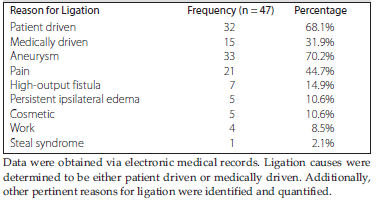 Results: Our results showed that, of the 47 renal transplant patients, 70.2% chose to undergo arteriovenous fistula ligation due to aneurysmal formation, 44.7% due to pain, and 14.9% due to high-output heart failure. In total, 68.1% of arteriovenous fistula ligations performed were primarily patient driven. There was an average follow-up of 2.9 years after ligation, with 1 unrelated reoperation and no returns to dialysis for all patients who underwent arteriovenous fistula ligation.