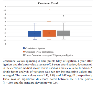 A single-factor analysis of variance was run for the creatinine values at 3 time points for all 47 patients and averaged. The mean values were 1.43, 1.48, and 1.47 mg/dL, respectively. There was no significant difference noted between the 3 time points (P = .90), and the standard deviation was 0.64 (Figure 2).