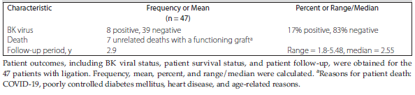 Our follow-up period averaged 2.9 years after ligation, with a minimum of 1.8 years and a maximum of 5.48 years (Table 3) (follow-up period was 2 years, and 4 patients were excluded due to unrelated death; they were removed from this calculation). During that period, we identified 3 cases of ongoing or new onset neuropathy/pain and 1 reoperation due to an unrelated traumatic arm injury. There were no readmissions for postoperative complications and most notably, no return to dialysis or need of dialysis access use for transplant rejection treatment. In our cohort, 7 patients died (reasons for patient death included COVID-19, poorly controlled diabetes mellitus, heart disease, and age-related reasons) with a functioning kidney transplant during the follow-up period. For BK virus, 8 (17%) patients were positive and 39 (83%) were negative after kidney transplant (Table 3).