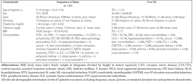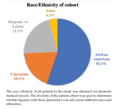 The average age of our cohort at the time of ligation was 51.9 years old, with an age range of 24.4 to 77.9 years and a standard deviation of 11.54. Our cohort consisted of 19 women and 28 men, 26 of whom were African American, 9 were White, 2 were Asian, and 10 identified their ethnicity as Hispanic or Latino (Figure 3). Only 3 (6.4%) of the 47 patients were active tobacco users at the time of ligation, whereas 13 (27.7%) were former users and 31 (65.9%) never used tobacco. For BMI, the mean for our cohort was 28.83 with a range of 18.79 to 40.92 and a standard deviation of 5.13. Finally, we collected information on comorbidities of patients in our cohort, the most common being hypertension (45 patients), heart-related comorbidities (15 patients), type 2 diabetes mellitus (17 patients), hyperlipidemia (9 patients), hyperparathyroidism (9 patients), cancer (6 patients), and liver-related comorbidities (6 patients) (Table 4).