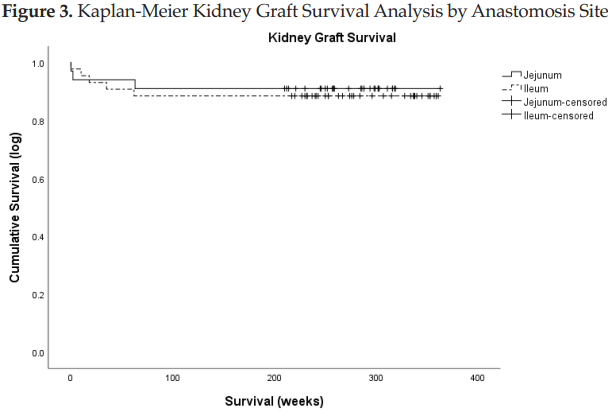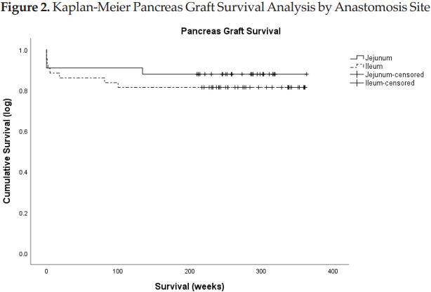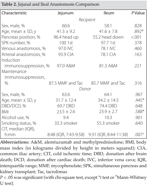 Forty-three SPK transplants were performed with ileal anastomoses, and 33 SPK transplants were performed with jejunal anastomoses. We observed no significant differences in demographics of recipients, donors, or immunosuppression regimens between anastomosis groups. We observed significant dif-ferences in the venous anastomoses between groups and pancreatic positioning; cold ischemia time was also longer in the ileal group (Table 1).