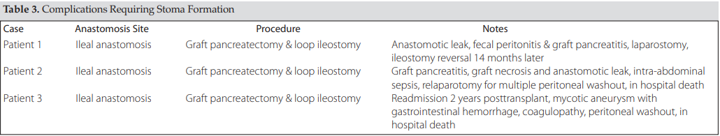 Three patients experienced pancreatic graft complications requiring salvage pancreatectomy due to 2 cases of anastomotic leak at exocrine drainage site, 1 with concomitant graft pancreatitis. The third case was due to severe gastrointestinal hemorrhage due to mycotic aneurysm formation. All 3 cases resulted in formation of loop ileostomy, after ileal anastomosis, multiple relaparotomies, and pro-longed critical care admissions, with 1 patient requiring long-term laparostomy and 2 fatalities in this group (Table 3).