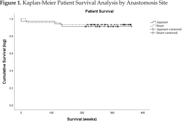 From analysis of our cohort, we suggest that the site of enteric anastomosis has no effect on graft or patient survival. However, as discussed, this needs to be considered in the context of the small sample size alongside the retrospective single-center study design. A larger population with prolonged follow-up may reveal significant differences between groups. In particular, the effects of the role of ileal lymphoid aggregations on immunogenicity over the longer term may be overlooked. We also acknowledge the lack of data on pretransplant gastrointestinal symptoms, as gastroparesis is often seen in this patient group.22 We also assessed gastrointestinal symptoms in a binary fashion with no qualitative assessment on quality of life. Finally, any differences in primary anastomotic leak rate should be robustly assessed with an appropriately powered study. A future randomized control trial with long-term follow-up could be used to investigate this.