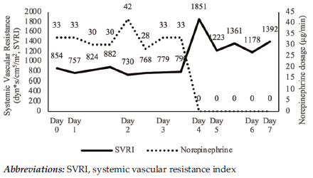 Vasoplegic shock symptoms quickly showed signs of resolution, and by the end of postoperative day 3 the patient no longer required norepinephrine or vasopressin, and taper of epinephrine was possible until full discontinuation on postoperative day 6. By postoperative day 4 systemic vascular resistance had increased to normal levels of 749 dyn*s/cm5 (indexed to body surface area 1851 dyn*s/cm5/m2).