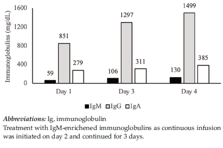 On postoperative day 1, initial antibiotic therapy was supplemented with a single dose of gentamicin, with addition of vancomycin and ciprofloxacin. Ciprofloxacin was discontinued on day 2, and vancomycin and meropenem were administered for a total of 9 days each. On postoperative day 2, the patient developed a fever of more than 39 °C and reduced diuresis of 80 mL/2 h despite continuous furosemide infusion. The patient's immunoglobulin levels showed IgG 851 mg/dL, IgA 279 mg/dL, and IgM 59 mg/dL. Treatment with IgM-enrichened immunoglobulins was initiated and continued for 3 days (Figure 2). In addition, from postoperative day 2 the patient received continuous hemodialysis with cytokine adsorption to remove excess inflammatory mediators (CytoSorb hemoadsorption filter, CytoSorbents Corporation).