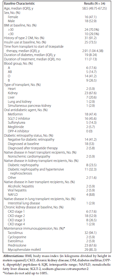 For our investigation, 34 SOTRs met the specified inclusion criteria, with all undergoing tirzepatide therapy posttransplant. Among the study cohort, 15 recipients (44.1%) received organs from living donors (all were relatives of the recipient, up to the fourth degree). Most patients (n = 31, 91.2%) received tirzepatide as part of a glycemic management approach. However, 3 patients with DM (8.8%) received tirzepatide as part of obesity management. The number of male and female participants was nearly equal, with 18 males (52.9%) and 16 females (47.1%). The median (IQR) age of participants was 58.5 (49.75-67.25) years. The initial dose of tirzepatide was set at 2.5 mg, administered once weekly via subcutaneous injection. Subsequent dosage adjustments were made in 2.5-mg increments, dependent on individual patient tolerability, with intervals of no less than 1 month between adjustments. Of note, only 1 patient (2.94%) progressed to the maximum weekly dosage of 15 mg within the study period. The median (IQR) tirzepatide dose utilized by participants at study conclusion was 5 (5-10) mg weekly. The median (IQR) time elapsed from transplant to tirzepatide therapy initiation was 2.91 (1.04-4.38) years, and duration of tirzepatide therapy lasted for a median (IQR) of 11 (7-13) months until date of data collection. Notably, all 34 patients were exclusively from the United Arab Emirates.
