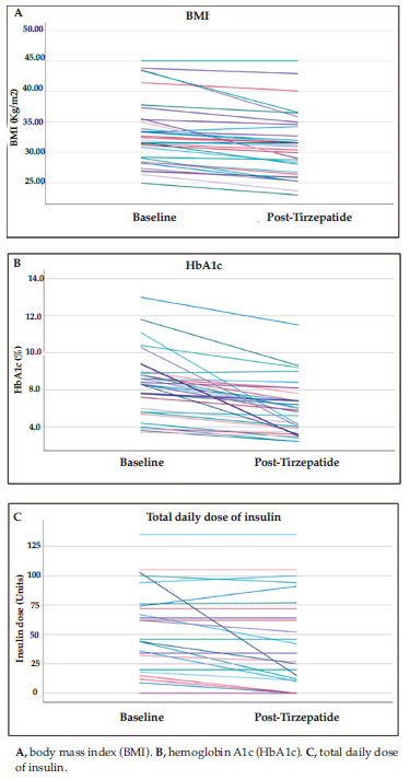 Although nearly half of the patients in our cohort were simultaneously receiving oral antidiabetic agents known to influence weight loss such as metformin and SGLT2 inhibitors, the observed improvements in primary outcomes are more likely attributed to tirzepatide. This inference was based on the fact that our study patients had a prolonged history of diabetes and had been on these oral antidiabetic agents from the time of diagnosis or shortly thereafter, without sufficient benefit as evidenced by approximately three-quarters of study patients becoming insulin-dependent. Considering the long-term administration of oral antidiabetic agents before tirzepatide initiation, patients may have already reached the full therapeutic potential of their oral antidiabetic agents. Consequently, we are able to dissect the effects of tirzepatide on primary efficacy outcomes from other concurrently administered oral antidiabetic agents.