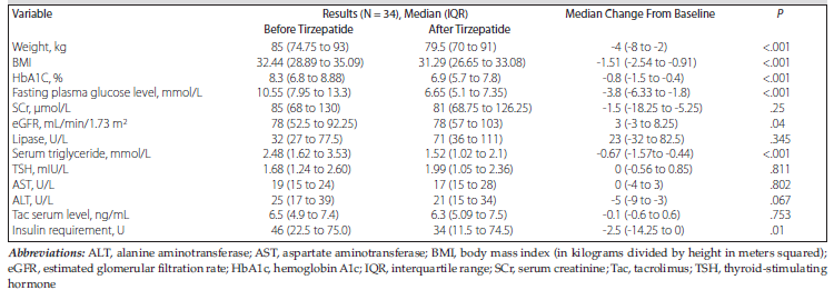 Results: Within our study cohort, the median time elapsed from transplant to tirzepatide therapy commencement was 2.91 years (range, 1.04-4.38 y), with use that lasted for a median follow-up duration of 11 months (range, 7-13 mo) until date of data collection. Tirzepatide facilitated optimal glycemic control, elicited significant weight reductions, and improved renal function without adversely affecting graft function or patient survival, showing an adverse effect profile similar to that of the general population, as shown in the literature.