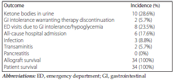 In terms of safety, 8 of 34 SOTRs (23.5%) who were receiving tirzepatide therapy required visits to the emergency department because of gastrointestinal intolerance or hypoglycemia, leading to hospital admission in most instances for further assessment (n = 6, 17.6%). However, only 2 patients (5.7%) opted for tirzepatide therapy discontinuation because of severe gastrointestinal intolerance. Throughout the treatment period, ketone bodies were detected in the urine of 10 patients (28.6%). Remarkably, there were no instances of pancreatitis, graft rejection, or patient mortality recorded in our study cohort (Table 3).