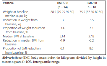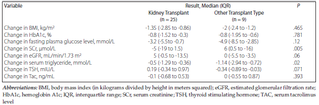 We also stratified patients within our study cohort into 2 subgroups based on baseline BMI, with 24 transplant recipients classified as obese (BMI >30) and 10 classified as not obese (BMI <30). At the end of follow-up, transplant recipients classified as obese demonstrated a 3.4% reduction in median weight from baseline, approximately half the percentage of weight lost among transplant recipients who were not obese (-7.3%). In addition, both the obese and nonobese groups demonstrated almost similar percent reductions in median BMI from baseline, at -6.1% and -8.6%, respectively (Table 5).