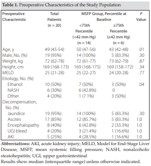 Of 24 patients enrolled, 4 patients were excluded, with the remaining 20 patients eligible for analysis (Figure 1). We divided patients into 2 groups according to their baseline MSFP by using the 75th percentile as the cut-off (42 mm Hg), with 14 patients in the low MSFP group and 6 patients in the high MSFP group. Median patient age was 49 years (IQR, 47-56 y) (Table 1). Patients in the high MSFP group tended to be younger (43 years [IQR, 42-48] vs 50 years [IQR, 47-56]; P = .01). The overall cohort included more male patients than female patients, and chronic liver disease from ethanol consumption was the most common etiology of liver disease. Patients with ethanol (50%) and other etiologies (50%) had a higher incidence of high MSFP than those with nonalcoholic steatohepatitis (0%; P = .04). Most patients had jaundice and ascites. The median Model for End-Stage Liver Disease (MELD) score was 25 (IQR, 21-28). Severity of liver disease, as measured by MELD, and the incidence of decompensations were similar in both groups. With regard to intraoperative details (Table 2), crystalloid requirement during the intraoperative period was lower in patients with a high MSFP (6250 mL [IQR, 5000-7000] vs 7500 mL [IQR, 6500-9000]; P = .04). Median blood loss was 1900 mL, which was similar in both groups. Blood product requirements were comparable between the groups.
