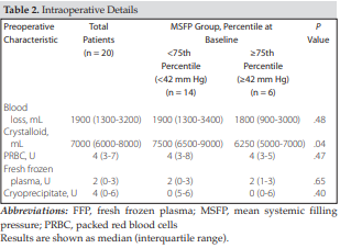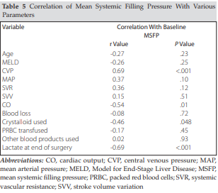 We included 20 patients (aged 18-65 y) who underwent living related donor liver transplant. The primary outcome was observed trends of MSFP at various stages of living donor liver transplant surgery. Secondary outcomes were the correlations between MSFP and various hemodynamic parameters, such as heart rate, CVP, mean arterial pressure (MAP), CO, SVR, and stroke volume variation (SVV), and to correlate baseline MSFP with intraoperative fluid requirement, blood loss, lactate at the end of surgery, and blood products used.