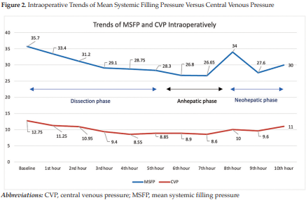 The decrease in MSFP values as surgery progressed from the dissection phase to the anhepatic phase could be because of blood loss in the dissection phase, which is a common occurrence in this phase.14 Blood loss and clamps in portal vein and inferior vena cava might have caused a shift of blood from stressed volume, resulting in the observed drop in MSFP during this phase.5 The increased MSFP in the postreperfusion stage could be attributed to the release of clamps on the portal and hepatic veins during reperfusion, leading to increased blood volume.