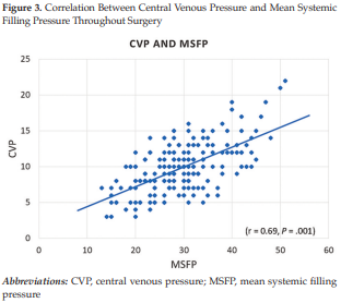 As MSFP increases or decreases, a concomitant increase or decrease should occur in CO. If RAP (or CVP) is low and MSFP is high, there is a maximum difference in the pressure and maximum return of blood to the right heart. On the other hand, if RAP increases but MSFP does not change, then there will be a small difference between the 2 variables, and VR will decrease. In our study, we observed a positive correlation between CVP and MSFP; hence, any decrease or increase in MFSP might have been offset by the concomitant alteration in CVP, resulting in a negative correlation between MSFP and CO at a higher MSFP range, as observed in our patient cohort.
