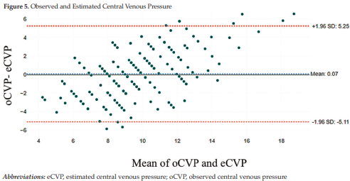 The inverse relationship between CO and MSFP was in contrast to the existing literature; thus, we performed additional analyses to explore this finding. From the regression equation, we arrived at the following formula: expected CVP = 1.68 + (0.27 × MSFP). The correlation between the observed and expected CVP had an r value of 0.62 (P ? .001). Although the observed and expected values were not well correlated, we applied the Bland-Altman plot to check for the scattering pattern between the observed and expected CVP. We could not compare MSFP and CVP because of their difference in the normal range; hence, we used expected CVP as a surrogate of MSFP to observe its behavior with extremes of CVP. At high values, the observed values were higher than the expected CVP values; at the low values, the observed values were lower than the expected CVP values (Figure 5). In short, as we faced a high CVP, the increase in CVP would be greater than that extrapolated from MSFP.