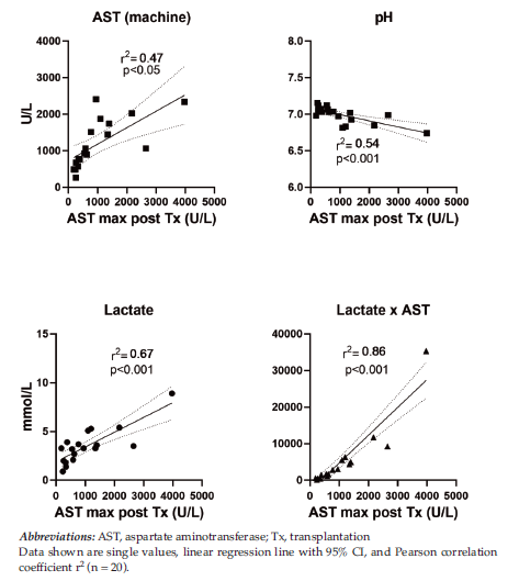 Significant correlations with peak transaminase levels after transplant were found for perfusate levels of AST, pH, and lactate, with best correlations evident for lactate (r2 = 0.67) (Figure 1).