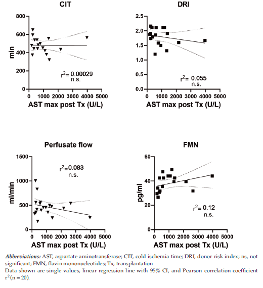 Other parameters often used for liver evaluation before or during machine perfusion, such as cold ischemia time, donor risk index, perfusate flow, and hepatic release of FMN, did not disclose significant correlations with peak transaminase levels after transplantation (Figure 2). Of note, early liver function (LiMAx) after transplantation did not significantly correlate with any of the above parameters. The best prognostic factor was the perfusate activity of AST, which showed a correlation factor of r2 = 0.11 (P = .10) ((Figure 3) and (Figure 4)).