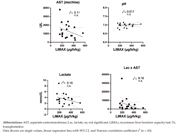Results and Conclusions: Significant correlations with peak transaminase levels after transplant were found for perfusate levels of glucose, aspartate aminotransferase, pH, and lactate, with best correla-tions being evident for the product of aspartate aminotransferase and lactate (r2 = 0.86; P < .001). Most interestingly, early liver function (maximal liver function capacity) posttransplant did not significantly correlate with these parameters. The best prognostic factor was aspartate aminotransferase level on the machine, which showed correlation factor of r2 = 0.11 (P = .10). Readout of hepatic functional recovery did not correlate with readout of morphological reperfusion injury (peak transaminase levels) (coefficient factor of r2 = 0.15). However, function might not easily be prognosticated by predominantly nonfunctional injury parameters. Further development and refine-ment of functional investigations of the organ during machine perfusion are thus recommended.