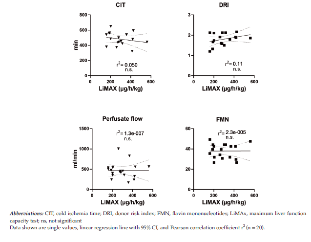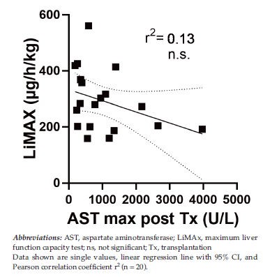 This LiMAx test has been reported to validly determine liver function capacity in liver surgery16 and to closely reflect different stages of chronic liver disease.17 Therefore, we sought to use this test as an alternative endpoint of graft recovery after liver transplant in conjunction with the predictive parameters obtained during pretransplant machine perfusion. We found that peak AST levels, cold ischemia time, and donor risk index did not exhibit any valuable correlation with the postoperative LiMAx value. Most surprisingly, however, the machine perfusion parameters also did not allow for prediction of LiMAx results after transplantation.