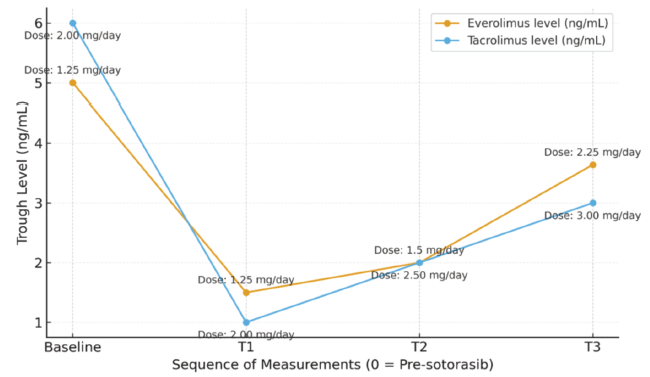 A 55-year-old male patient underwent living donor kidney transplant from his brother in 2008 and was maintained on long-term immunosuppression therapy with tacrolimus (Prograf, Astellas Pharma), everolimus (Certican, Novartis Pharma), and pred-nisolone (Deltacortril, Pfizer). For several years, his blood trough levels had remained stable for tacroli-mus at a range of 5 to 6 ng/mL and everolimus at approximately 6 ng/mL. In early 2023, he was diag-nosed with stage IV KRAS G12C-mutated lung adenocarcinoma. After 13 cycles of chemotherapy and radiotherapy, sotorasib 960 mg/day was initiated. At a routine follow-up approximately 5 months later, his blood trough levels had decreased to 1 ng/mL for tacrolimus and to 1.5 ng/mL for everolimus, despite unchanged dosing and confirmed adherence. The patient reported no recent dietary modifications, no use of grapefruit juice, and no use of any herbal or dietary products known to interact with cytochrome P450 enzymes. The patient had no gastrointestinal, hepatic, or metabolic comorbidities that could affect drug absorption or metabolism. Liver function tests were within reference ranges, and no clinical signs of malabsorption were present.