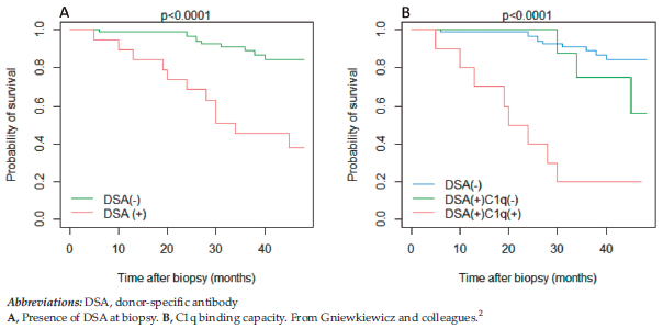 To better assess the predictive value of HLA DSAs for renal graft outcomes, their criteria, including MFI level, C1q-binding capacity, and IgG subclasses, have been broadly analyzed.9 In addition, C1q-binding capacity has been recently shown as an independent predictor of increased risk of AMR evolution, allograft loss, and death in kidney transplant recipients (KTRs) (Figure 1).2,10