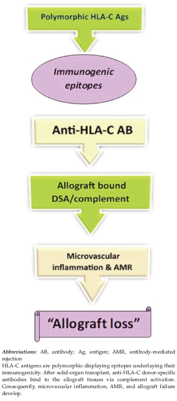 For decades, the relevance of anti-HLA-A, HLA-B, HLA-DR, and HLA-DQ donor-specific antibodies (DSAs) in solid-organ transplant (SOT) has been well-recognized. However, the clinical relevance of HLA-C DSA remains poorly understood. Compared with HLA-A and -HLA-B, the low expression levels of the HLA-C gene and its related proteins have been attributed to several intrinsic and extrinsic factors, such as lowered immunogenicity with diminished prevalence and strength. However, HLA-C antigens are immunogenic and have clinical relevance in generating HLA-C DSAs.1