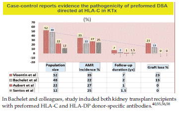 Several case reports52-56 and case control studies56-58 have provided robust evidence of the preformed anti-HLA-C DSA pathogenicity in SOT. For example, 2 preformed anti-HLA-C DSAs have been reported to trigger T-cell FCXM positivity followed by hyperacute rejection in 2 KTRs. Moreover, these DSAs could be eluted from the rejected graft and recognized via SAFB testing.
