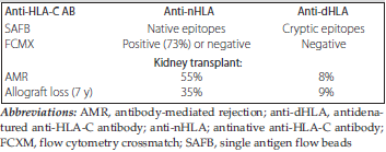 Transplant recipients may express 2 types of anti-HLA-C antibodies: (1) the antinative anti-HLA-C antibodies, which can recognize HLA-C antigens that are expressed on human cell surface and SAFBs, and (2) the antidenatured anti-HLA-C antibodies, which can recognize the cryptic epitopes present on the degraded HLA-C antigens, which are enriched in SAFB reagents but are usually lacking on the surface of human cells. The antinative-HLA anti-donor =HLA-C can provide positive FCMX results with detrimental outcomes in kidney transplant. On the other hand, the antidenatured HLA anti-donor HLA-C cannot induce positive FCMX, showing no clinical relevance. Only Visentin and colleagues provided the prevalence of AMR and allograft loss39 (Table 1).