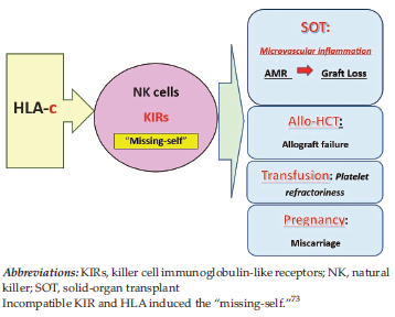 Of note, these antibodies can be detected by CDC testing, which proposes a highly assessed MFI. Regardless of the possible target by the DSA, HLA-C antigens can represent a crucial role in natural killer (NK) cell response, considering that certain amino acid particles can modify the binding ability of the NK receptor family, specifically killer cell Ig-like receptors (KIRs).69 This finding on KIRs has been inconsistent in the SOT field, as reported by Tran and colleagues.70 Recently Koenig and colleagues71 have also supported this, observing that the microvascular inflammatory response can be expressed by the NK cells in transplant recipients devoid of DSAs yet presenting mismatching between donor HLA-C and their KIRs.