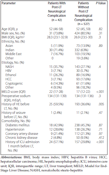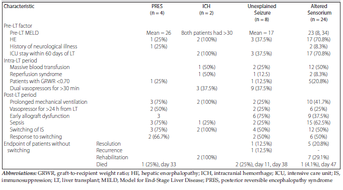 The literature has documented a wide range of NC, including seizures, encephalopathy, posterior rever-sible leukoencephalopathy syndrome (PRES), stroke, meningitis, central pontine myelinolysis (CPM), cerebellar syndromes, headache, neuropsychiatric manifestations, cognitive decline, sleep disturbances, tremors, and peripheral neuropathy. Encephalopathy, typically occurring within 30 days posttransplant, is the most frequent NC after LT.6,7 Posterior reversible leukoencephalopathy syndrome, a clinico-radiolo-gical syndrome characterized by cerebral vasculature dysregulation, results from vasogenic edema, which primarily affects the parieto-occipital regions.8 Encephalopathy can progress from mild alterations in consciousness to delirium and coma. Calcineurin inhibitors (CNIs), used as immunosuppressants after LT, can cause neurotoxicity leading to symptoms such as tremors, headaches, and cerebellar and extrapyramidal features.1 Intracranial hemorrhage (ICH) post-LT, often associated with coagulopathy and acute or chronic hypertension, can have severe consequences. Identifying predictors may help in selecting and exploring preventive treatment options to reduce the risk of post-LT NC. In this study, we analyzed the incidence and risk factors associated with NC in LT recipients.