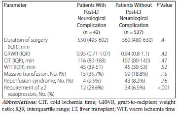 Collected operative variables included surgery duration, cold and warm ischemia times, blood transfusion, graft-to-recipient weight ratio, reper-fusion syndrome occurrence, blood product trans-fusion details, and vasopressor support requirements. In this study, we defined high blood transfusion as the administration of >6 packed red blood cell units. Reperfusion syndrome was classified according to the definition of Aggarwal and colleagues.10
