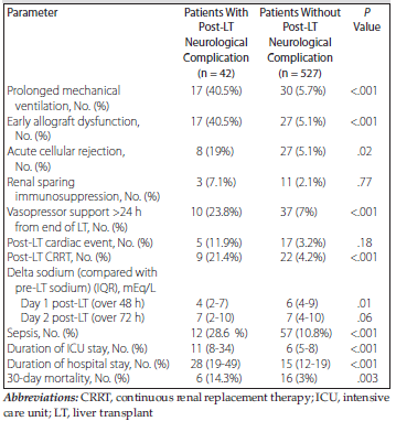 Liver transplant (LT) is associated with a higher incidence of neurological complications (NC) com-pared with other solid-organ transplants, affecting up to 30% of recipients and greatly affecting post-LT mortality and morbidity.1-3 These complications stem from various factors, including metabolic issues, oxygen deprivation, medications, infections, or organ rejection.4,5