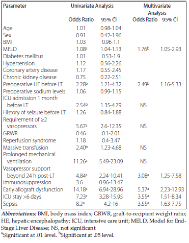 Results: Among 569 liver transplant recipients, 42 (7.4%) developed neurological complications. Complications included altered sensorium, convulsions, localized neurological deficits, posterior reversible encephalo-pathy syndrome, and intracranial hemorrhage. Using logistic regression analysis, we identified several independent factors that predicted neurological complications after liver transplant. These factors (odds ratio; 95% CI) were preoperative Model for End-Stage Liver Disease score (1.76; 95% CI, 1.05-2.93), preexisting hepatic encephalopathy (2.49; 95% CI, 1.16-5.33), requirement for vasopressor support for >24 hour from end of surgery (3.08; 95% CI, 1.25-7.58), postoperative sepsis (3.55; 95% CI, 1.51-8.34), early allograft dysfunction (5.37; 95% CI, 2.23-12.93), and duration of intensive care unit stay >6 days (3.55; 95% CI, 1.63-7.75). Utilizing regression coefficients, we created a risk index, named Neurological Compli-cations Post-Liver Transplant score (NC-PoLT). A score ≥4 predicted neurological complications after liver transplant (area under the receiver operating curve of 0.87).