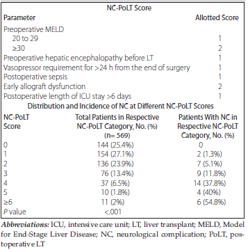 Conclusions: The NC-PoLT scoring index can serve as a tool to identify patients who may be at risk of developing neurological complications after living donor liver transplant. This internally validated metric aids in predicting outcomes and recognizing target groups for preventive strategies. However, an external validation of this score has not yet been conducted.