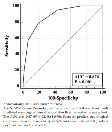 Seizures and headaches are the most commonly observed NCs in the pediatric population.22 Our study conducted on adults identified altered senso-rium as the most prevalent NC, consistent with findings of Derle and colleagues.23 The neurotoxicity associated with immunosuppressants is a recognized cause of NC in both pediatric and adult patients undergoing LT. Although NC linked to immunosup-pression agents is not dose-dependent, the choice of the immunosuppression agent is considered a significant factor. Predictive measures may assist in planning the immunosuppression regimen in advance or facilitate an early switch, if feasible.24 In a study done by Donmez and colleagues involving 50 pediatric patients with NC post-LT, only 4 patients exhibited elevated CNI levels, suggesting an idiosyncratic relationship between CNI and NC. The study further concluded that LT recipients experi-encing seizures should undergo imaging as a matter of urgency, with a preference for magnetic resonance imaging over computed tomography, due to its superior diagnostic capability.25 In such instances, a predictive model such as the NC-PoLT scoring system can provide guidance on the optimal timing for preemptive imaging. In addition, a predictive model can aid in prognosticating outcomes for patient families and in the efficient allocation of resources.