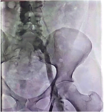 The lower extremity venography revealed complete stenosis at the level of the right femoral vein and partial thrombus in the left common iliac vein with collaterals (Figure 1). On cystoscopy, the urethra was normal in its entire length, and bladder capacity under general anesthesia was 1000 mL.