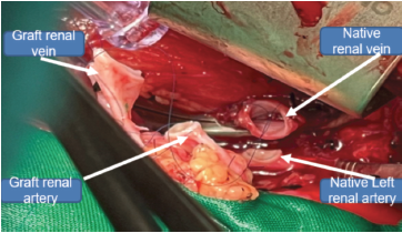 In the recipient, because the right iliac fossa was occupied and iliac vessels on the left side were diseased, a decision was made to perform an orthotopic left kidney transplant with peritransplant native nephrectomy in October 2023.