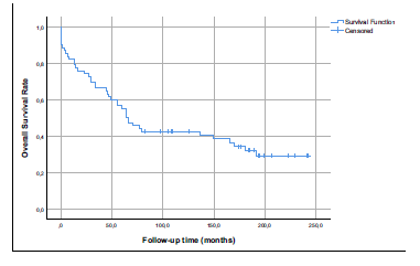 Figure 1. Overall Survival in 63 Patients Who Underwent Liver Transplant Recipients Because of Hepatocellular Carcinoma