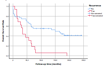 Median survival was significantly lower in the recurrent group than in the nonrecurrent group (33 vs 149 mo; P = .001) (Figure 2). The 3- and 5-year survival rates for the nonrecurrent group were 74% and 63%, respectively. However, for the recurrent group, the 3- and 5-year survival rates were 43% and 31%, respectively. During follow-up, 8 patients (12.6%) developed secondary malignancies (skin, lung, and hematological cancers).